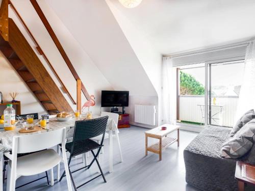 1-room studio 40 m2 on 2 levels on 2nd floor. Beautiful furnishings: living/sleeping room with 1 double sofabed (1 x 140 cm, length 190 cm), TV (flat screen). Exit to the balcony. Kitchenette (mini-oven, 2 induction hot plates, grill, electric coffee machine, combination microwave). Bathroom, sep. WC. Electric heating. Upper floor: (steep stair) gallery with sloping ceilings with 2 beds (80 cm, length 190 cm). Small balcony 2 m2. Terrace furniture. View of the resort. Facilities: hair dryer. Internet (WiFi, free). Reserved parking space n 50 (1 car). Please note: smoke alarm.