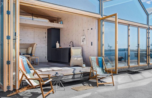 Spend your vacations in a prime location by the water in this compact and comfortable apartment. The modern apartment is equipped with everything you need to feel comfortable and live. Enjoy the view from the living room and the sleeping loft through the panoramic window to the outside. When the sun shines, you can open the window wall and sit outside on the deck chair with your morning coffee.