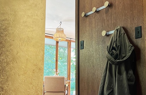 The rental unit has a private entrance from the parking area via a rustic, natural hiking trail through the woods where appropriate shoes/boots are a must. You enter into the Main bedroom with Ensuite bath that has been separated from the rest of the house. There is 1 queen bed. The chaise lounge and couch that folds flat can be slept on by a child. A kitchenette and 2 sitting/eating areas help to enjoy the wild untouched natural view.