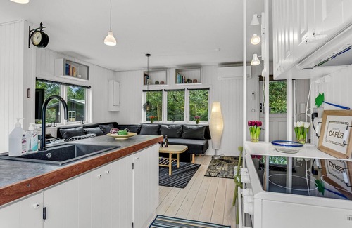 Your inviting holiday home is located on a large, well-kept plot not far from the Flensburg Fjord and offers you the best conditions for relaxing days in natural surroundings. Enjoy the light-flooded living area with light-coloured wooden floors and stylish furnishings. Put your feet up on the large sofa, read a book or enjoy meals together in the cosy dining area. The open-plan kitchen is modernly equipped and there is a small underground cellar under the kitchen, ideal for chilling drinks.