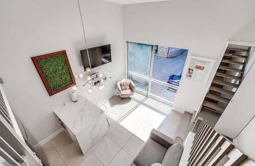 Unique offering of 2 units located in the heart of the vibrant Little Italy neighborhood of Downtown San Diego. Designed for hip, urban living by award winning architect Jonathan Segal, this offering inlcudes a ground level 1br+1ba & rear 2 level studio loft. Features high ceilings, full floor windows, SMART TV, King and Queen beds, Dogs ok, AC, & designer touches throughout. Maximum occupancy 6 (4 adults max). (Notes: There is no washer/dryer or onsite parking. The loft ceiling in the rear unit is low, guests will need to use caution when standing up).