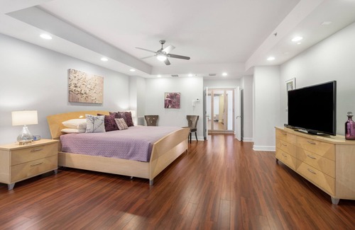 The huge master bedroom has a king bed, and sitting area. The luxury master bath has double sinks and shower heads, a jetted tub, vanity area, and private specially equipped toilet room. The two queen bedrooms are ensuite with private baths.There is a fully stocked gourmet kitchen with island, breakfast bar, eat in dinette,and an adjoining family room. There's more.. 3 large flat screen TV's, fine linens and mattresses, a large wrap around terrace, secure building parking, Wifi, large laundry room, and stylish lighting and decor.