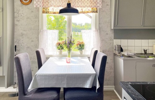 This charming rural villa is located in beautiful Dalsland. The house is of an older style that has been warmly renovated inside. Here there are plenty of green areas for the children to play. The house is located on a farm elevated on a hill with beautiful views of the surroundings. Here the best of two landscapes meet, Munkedal in Bohuslän and Valbo-Ryr parish located in Dalsland. You are close to swimming in several lakes around, one by the church about 5 minutes by car. You are welcomed into a smaller hall. The kitchen is newly renovated in 2023 with light and warm country style. Adjacent is the living room with comfortable sofa, armchairs and TV corner. The kitchen has everything to offer. Large fridge and freezer if you find fishing luck in any of the lakes. A fishing license is required, which can be bought in Munkedal or Färgelanda. The staircase is bright and the older charm remains. Next to this is a small bathroom with washing machine wc, sink and small shower area. The stairs up lead you to the bedrooms with a large bedroom with a double bed of 180 cm. The living room has a desk and a bunk bed for 2 beds. The house is perfect for the family of 4 people or the group of 2-4 people. There has been a cat in the home and there is a cat living in the yard. There is a great chance to see Sweden's wild animals roaming the grounds such as deer, hares, foxes and, if you are lucky, even moose. If you want to get to the sea, you can easily do so with a day trip to the beautiful Saltkällan. Dalsland itself has a lot to experience and see and it is probably beautiful nature. Here you will enjoy yourself and have an enjoyable holiday Welcome.