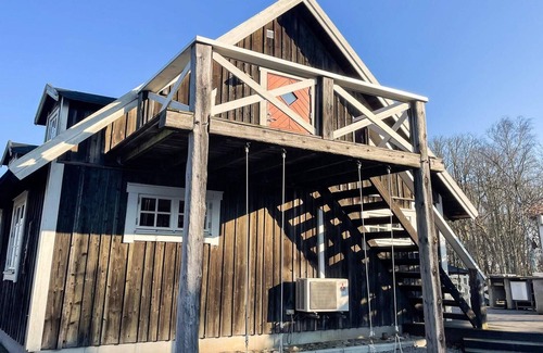Fantastic location for family and friends to holiday together on Aspö in the Blekinge archipelago. There are three properties of different sizes on the plot that are rented out in addition to the property the owner himself disposes of. For large groups who want to celebrate something or want to spend time together in a pleasant environment, it is recommended to rent all the houses. Free boat traffic from Karlskrona city center takes 25 minutes. Swimming, fishing and fantastic nature can be enjoyed on this bicycle-friendly island. Enjoy a swim in the hot tub, which is shared by the three properties and booked directly by the owner upon arrival. Large lawn with play equipment and games such as darts, kubb and boules. There is also a barbecue area with seating in the garden for everyone to use. Boat is also available for rent on site. In this upper floor that can accommodate the large family or several smaller families, you have a view of the sea and the large boats that pass close by Aspö. The entrance upstairs has a furnished balcony for a relaxing moment and also a gate at the stairs for child and dog safety. Inside the entrance after the hall for hanging up outerwear, all bedrooms are located along the long corridor. Each room has a double bed and window as well as space for storage. At the other end of the floor is the spacious living room with high ceilings and endless views through large opening glass panels to the balcony overlooking the sea. The kitchen is well equipped for self-catering and there is a dining table with room for everyone at shared meals. Armchairs and a sofa group for pleasant recovery are also available in this open-plan room. The balcony overlooking the sea has several sitting options for relaxation. The bathroom between the bedroom and kitchen area is equipped with a shower and washing machine for all conveniences in addition to a toilet and sink. The castle, which is beautifully preserved just a short walk from the accommodation, is an attractive tourist destination with a lot of history, music events and a restaurant open in summer. The island offers a varied nature with white sandy beaches, cliffs and lush deciduous forest to explore. A grocery store with delivery service for pharmacies, system companies and post offices is open all year round in Drottningskär. For those who are active, there is the opportunity to book a tennis and paddle court nearby.