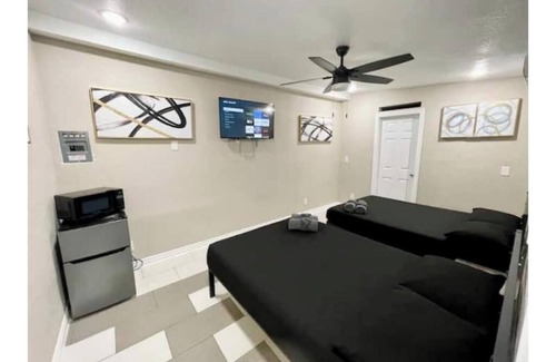 Make some memories at this unique and family-friendly place So this studio has their own private entrance has two full size beds no kitchen with a mini fridge and microwave private bathroom the outside is under construction It doesn't have a nice view in the outside yet but it will be soon is attached to other three studios next to it and one RV every studio have a private entrance with your own parking space, the neighborhood is calm and friendly it's not top notch but you love your stay.