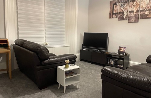 Newly renovated 1 Bedroom Ground Floor Flat. Fully equipped open-plan kitchen/ diner perfect for a short or long stay. High ceilings lead into a stylish comfortable living room with SMART TV with Roku Stick, leather sofas, and a workstation. The relaxing double bedroom has a new top-of-the-range Simba Mattress and storage for your luggage. Immaculate shower room/ WC. Passcode entry system so you never need to worry about loosing your keys.