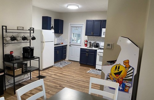 Renovated duplex minutes from downtown Geneva. This house renovation was intended for guests to feel like this is their home away from home. Your family will be close to everything when you stay at this centrally-located place. The 1st floor offers fully equipped updated kitchen, large eating area and living room with sleeper sofa. Upstairs you will find a full bathroom, one bedroom with a king size bed, and the other bedroom has 2 twin beds, plus arcade game! . Washer and dryer are located in the unfinished lower level. Plus Central Air!