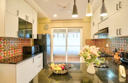 The apartment boasts of modern, stylish decor well equipped with high speed internet, towels, bed linen, toiletries,24/7 security, housekeeping ,a large pool, covered parking and a gym. The apartment has a large 55 inch flat-screen Smart TV, a fully equipped kitchen with a microwave and washing machine with large balcony with a swing .The decor boasts of the famous Goan artist Mario Miranda's artistry that blends the Goan Bohemian vibe with modern furnishings.The decor is hand picked to blend in the Goan ambience into the space.