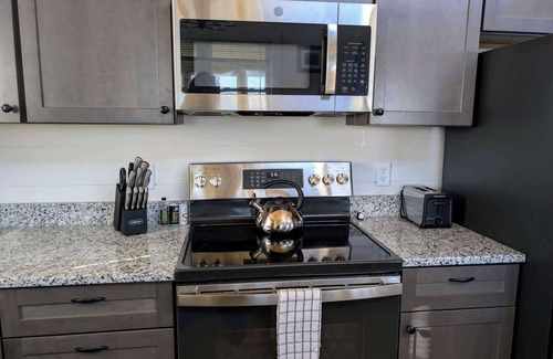 Living room: New comfortable furniture and a large smart TV for family time. The couch pulls out to a sofa bed for 2 guests.