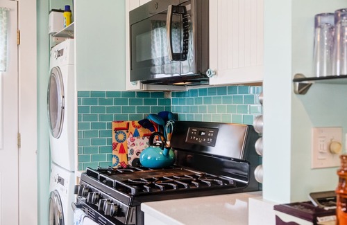 Updated kitchen with gas stove, dishwasher, microwave, airfryer, keurig, washer and dryer.
