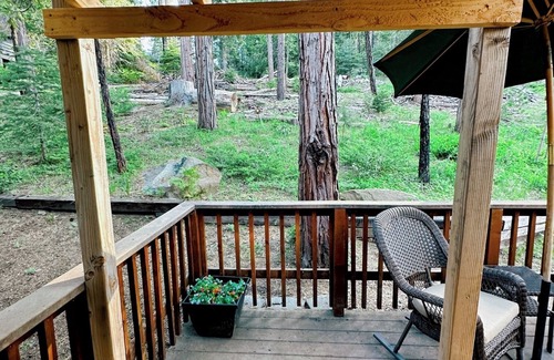 The 560 square foot front deck wraps around three sides of the house, bringing the outdoors right to your feet. And who wants to eat indoors when the perfect Summer weather calls you outside to dine on our custom-made, bar height picnic table? As an alternative, sit out on the back deck which offers a view of the landscaped area and the undeveloped forest beyond. In the Winter you will be glad you've chosen to rent a newly-constructed, well-insulated cabin with double-paned windows plus two sources of warmth - the fireplace and central heat. AND - we've added a generator in May of 2022 so that you will never be out of power - even when PG&E power goes out all around, our lights, heat (or AC) and all other amenities will still be on!!