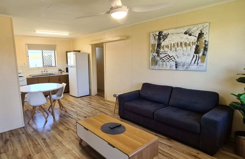 A comfortable lounge and 3 seater dining table all have views of the TV fitted with chrome cast. The open kitchen is equipped with electric stove and oven + a microwave as well as basic cooking utensils and cutlery. Both bedrooms are airconditioned with reverse cycle split systems and 2 windows, built in robes and fans as well as charging stations. The bathroom offers a shower over the bath and quality shower head and a separate toilet which is located off the laundry. The laundry is equipped with a front loader washing machine and has access to the carport and to the back yard which has the clothes line.