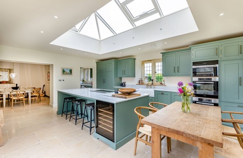 French doors to the garden, central island with three bar stools, two electric ovens, induction hob, fridge with large freezer drawer, wine fridge, microwave, dishwasher, kettle, toaster, Nespresso coffee machine, four-seater dining table, armchair, Apple HomePod and Smart TV with Sky and apps