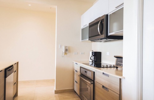 As our guests, you will have full access to all the amenities provided in the building. The apartment is adequately provisioned with a fully equipped kitchen, comfortable living room with a large flat-screen TV, and a private balcony with stunning ocean views. Additionally, the building offers a range of amenities such as a swimming pool, fitness center, and a spa that you are welcome to use during your stay.
