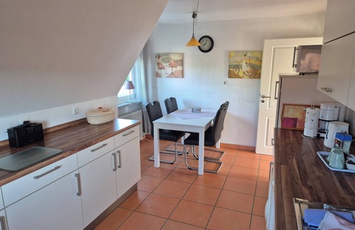 We rent a cozy 66 square meter apartment on the upper floor, with new fitted kitchen, a double bedroom, a bedroom with sturdy bunk bed (also suitable for adults), a living room with sofa bed and bathroom with toilet and shower, situated in the center of Schleswig-Holstein, south of the North Sea-Baltic Canal, near Rendsburg.