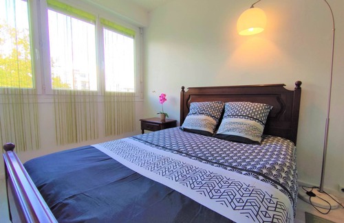 2 independent bedrooms: one with a large double bed and a storage cupboard and one with 2 twin beds and a wardrobe a fully equipped kitchen (fridge, electric hob, extractor, mini oven, dishwasher, microwave, electric coffee maker, toaster, kettle) a main room of 27 m², pleasant and bright thanks to its large bay window over its entire width a bathroom equipped with a modern shower and a washing machine a separate WC a 7 m² balcony and a loggia a digicode and an intercom a flat-screen TV with DVD player and a FREE Fiber Internet connection for your moments of relaxation a PRIVATE AND FREE parking space available for your vehicle and a bicycle room in the basement Bed linen and towels are provided for 4 people (package of 29 €)
