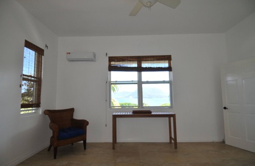 The master bedroom has a queen bed, A/C, vaulted ceilings and fan, and en-suite bathroom with walk-in shower/window looking out to Nevis. The master bedroom on this floor with its own balcony, and the guest bedrooms down stairs, all have the same beautiful view. A large walk-in closet off the master bedroom stores sheets, towels and supplies while still giving space for clothing and suitcases, etc.
