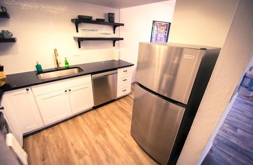 During your stay, you will have easy access to the home with the keypad entry and will enjoy the convenience of self-check-in. The beautifully renovated kitchen is stocked with silverware, utensils, pots, pan, dishes, mugs, glasses, plates, and bowls. The pantry holds spices and other cooking essentials if you decide to cook during your stay. There are a dishwasher and a laundry room in the unit for use as well as an iron and ironing board! The bathroom has soaps, some bathroom essentials, and a dryer for use also.