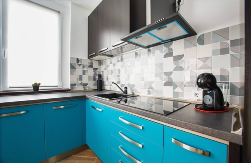 Designer flat with private bedroom and open space living room with fully equipped kitchen that has everything you could desire to prepare your meals from cutlery, plates, pan and pots to full appliances like gas hob, oven, electric kettle and of course, a coffee machine. Sofa bed can be easily converted into a double bed so our apartment can easily accommodate up to 4 guests. Our apartment has underfloor heating and A/C unit to cool those summer days.