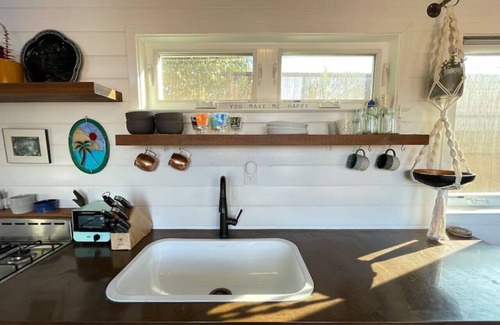 Curious about tiny house living? This home offers the full tiny living experience. We built the house 3 years ago and lived in it full-time for one year. It was a great reminder that we don't need a lot to live a full happy life. The home has a 24" stove with oven, a fully stocked kitchen, heater, and an elevator loft for luggage storage. The house also has a bar window that opens up to a deck where you can enjoy a meal or sip your morning coffee. The backyard offers a patio table and a private BBQ grill in case you want to enjoy the wonderful bay area weather. This makes for a great weekend stay if you just want to getaway from city living. Bring your bikes and take a short ride to the bay trail which takes you on a wonderful ride to the bay bridge or come and work remotely with our wicked fast fiber internet (400Mbps up and down).