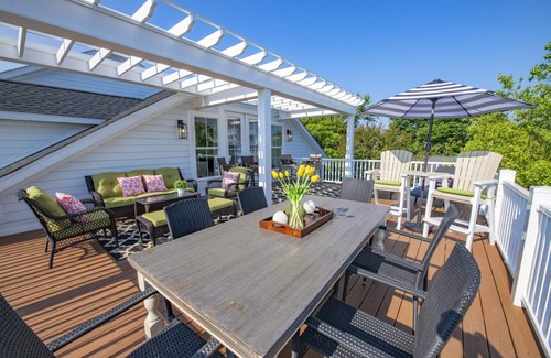 This is one of our most sought-after properties with the beach located just steps away from your front door! This stunning 2,800 square foot two-story home features plenty of space to relax indoors and out, including a large three-season porch on the first floor, a comfortable screened porch on the second floor with wood paneled ceilings and a 65” television, and an expansive second story deck with stunning views of the Atlantic Ocean. A small balcony overlooks the property’s relaxing private pool, which can be heated from early spring to late fall.
