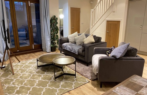 Beautiful 2 bed house available with secure parking and outdoor space. It offers 2 bedrooms with smart televisions and storage space, 1 double, 1 king, 1 bathroom with bath and shower, towels, shampoo, conditioner, shower gel, living room with kitchen and appliances, dishwasher, fridge / freezer, oven, toaster, microwave, kettle, cutlery, glasses, plates, bowls, fire extinguisher& first aid kit. Utility room has washer / dryer, ironing board and clothes rack. Outdoor space has room to park 2 cars. Convenient, Self Check in now available.