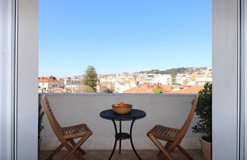 From the nice balcony you have a wonderful view of Nice and the hills that surround the city. There is a dining table with seating for 4 people and also a small cafe table with two chairs.