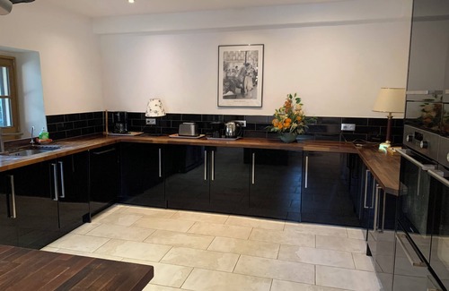 A dining room and large, well-equipped kitchen including: electric kettle, 2 ovens, toaster, dishwasher, hotplates