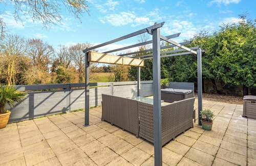 Separate Toilet.. Gas central heating, electricity, bed linen, towels, Wi-Fi and fuel for open fire included. Welcome pack. Back garden with ( patio, sitting out area, terrace and garden furniture. Hot tub for 6 (private). Outdoor heated swimming pool (private, open April-September). Private parking for 5 cars. No smoking. Please note: Sorry, no stag or hen parties.. Located in the picturesque Surrey Hills, this charming countryside bungalow offers an idyllic retreat for groups of two to ten guests, perfect for both short escapes and extended breaks. Nestled amidst serene surroundings, the property promises tranquillity and breathtaking views, ideal for unwinding and exploring nature’s beauty.