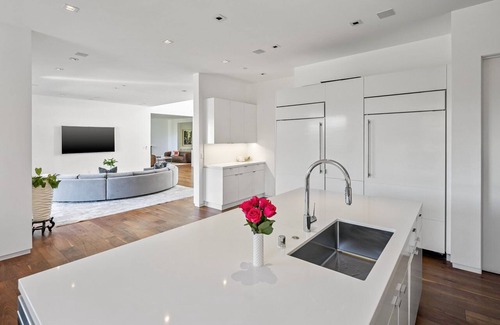 This private modern Estate provides beautiful and serene views through out the home that open to lush outdoor entertaining spaces, all which span with the views of the ocean and Bel Air canyon in the background.