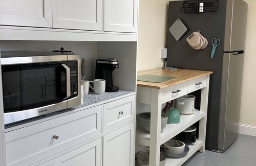 The kitchen has ample space and appliances should you desire to eat in. There is a coffee maker (pods or brew), microwave, hot plate (induction), mini convection oven and full sized sink and refrigerator.