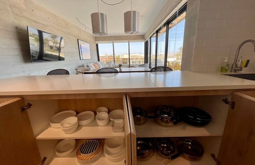 Built in 2023, this brand new unit is a gem because if its giant terrace corner terrace with open windows bringing the desert and ocean vibes inside. One of the largest condos in the building, this unit can comfortaby fit up to 9 adults, or 11 people including the service room. Time to gather the fam and head to Paracas! It is also located at Kite Club Paracas, which offers guests full access to shared amenities including: a gym, lagoon, shared swimming pools and coworking space.