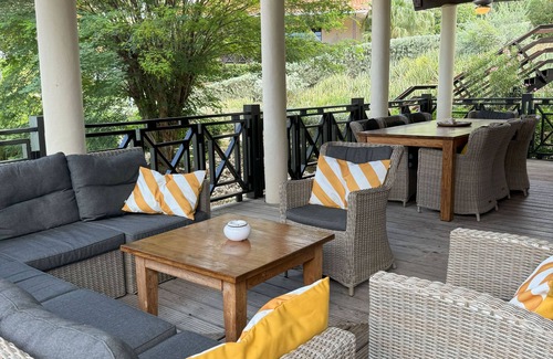 The 70m² veranda seamlessly extends from the living area through sliding doors, creating an ideal outdoor living space. Furnished with seating, a dining table, and couches, the porch offers a tropical garden view and a place to relax, dine, and sunbathe in the shade.