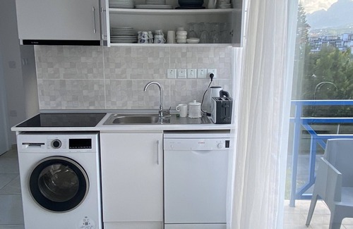 Brand new holiday apartment complex and panaromic view of sea and Mountain view! walking distance to ever so popular escape beach. new stylish posh district of Alsancak, Cafe culture become even more trendy with Gave cafe literally across from us. you can explore many other things nearby Girne has many shopping streets and marina. accomodation itself has beautiful blue and white tailored interior design, brand new kitchen with Bosch appliances, this place hasn't been used at all.