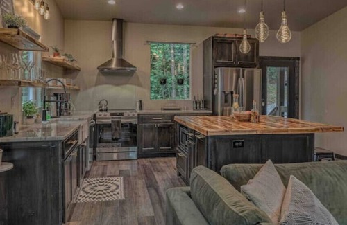 Off of the open living space, you'll find a quaint bedroom with large windows where you can stargaze before for restful night of sleep on a comfy kind sized bed. The cabin's bathroom is a beautifully appointed space with all the modern amenities you need, ensuring your stay is as comfortable as it is charming. Soaking in the large tub is a must!