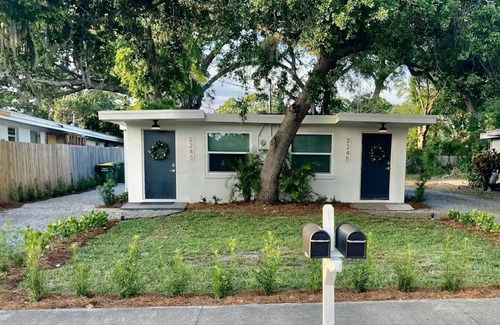 Bay Street Bungalow-West is a stylish well-equipped studio and one half of a duplex located in the heart of downtown Sarasota within walking distance to shops, restaurants, museums, the City's largest park (featuring 12 Har-Tru tennis courts), and the Legacy bike/run/walk Trail that spans 20 miles. It is situated in the tree-lined artistic and emerging neighborhood of Alta Vista. The studio features a Murphy bed, convertible couch, full kitchen, marble shower, AC/HEAT, W/D and a private patio.