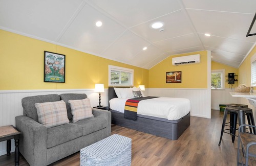 This quaint cabin has a queen sized bed with storage underneath and a twin sized pull out sofa. It has a bathroom with a shower, along with heat and air conditioning. This cabin has a bar top and stools for enjoying meals indoors, and patio furniture for enjoying time out in the fresh mountain air. We have wifi on site for all of our guests. Please let us know in advance if you are bringing your pup along with you.