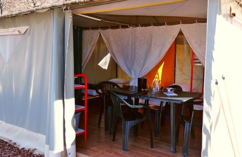 Canvas Bungalow at the edge of the water at Camping La Romiguière * | House in Montpeyroux