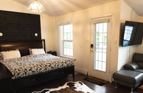Stay in the newest Executive Suite in Wolfville in one of the town's most iconic buildings, The Gingerbread House. The Carriage House was newly recreated and is our only suite with a full kitchen. It has a beautiful king bed with reclining and massage options. We have automated power blinds for added comfort. Two TVs so you can watch TV in bed or from your 6-person sectional couch.
