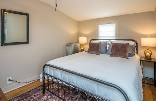 This second floor apartment in the heart of Gorham has a "kids room" with games and two twin beds (check the trunk for more games!) on the first floor, along with the living room, kitchen, and bathroom, and upstairs you'll find two bedrooms with queen sized beds.