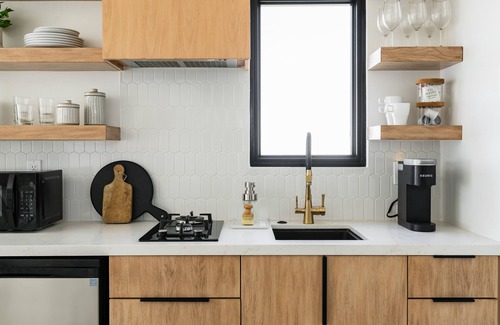 Full (mini) kitchen with a 2-burner stove, small fridge with a separate freezer, and sink. It has the basics like plates, bowls, glasses, wine glasses, silverware, and cookware. There is also a microwave and a coffee machine. There is coffee and tea, oatmeal, and some snacks available to you during your stay.