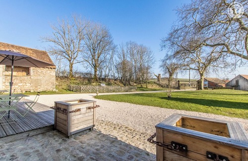 Alain-Philippe opens the doors to an authentic elegant castle from 1650, a building full of character steeped in history, carefully restored in accordance with the rules of the art, located in a peaceful setting in the heart of of a small rural hamlet nestled on an exposed plateau overlooking the surrounding countryside. Magnificent hilly country setting surrounded by wooded hills, nestled in the heart of the Charolais bocage, between gentle meadows & beautiful wild forests. A stone's throw from the medieval city of Mont-St-Vincent (12th century Romanesque church, ramparts, Tower of the Assommoir, old houses, archaeological museum ...) nestled on the sides of the eponymous mountain, unique belvedere offering a sumptuous 360 ° panorama over 14 departments, from Mt-Blanc to Puy de Dôme. Neat property fitted out in the spirit of a "micro-farm" (henhouse, cages for rabbits, horses & ponies parked on site), offering a delightful lawned park with hundred-year-old trees (with private terrace), a pétanque court, a covered terrace with summer kitchen and a large courtyard housing a play area for children (table tennis, punchingball and multiple leisure and games equipment). Spacious cottage of great comfort. Warm and sophisticated bourgeois cachet (stylish furniture & decorative accessories), enhanced by a very careful heritage restoration (majestic stone staircase, stone & brick walls, stone lintels, original wooden glass roof ...). Lots of charm & character. Soft and exotic atmosphere of a house steeped in history. Composition: Gite adjoining owners' house (total independence). Gas central heating. Pellet stove. Wireless. Washing machine in outdoor laundry room. Ground floor: semi-professional kitchen, living room, separate toilet. 1st fl. : 3 bedrooms (2 with double bed 160x200cm / double bed 140x190cm + 2 single beds 90x190cm). with private shower room (shower / WC). Terrace + covered terrace + private parking. Common ground (1700m²). Local bicycles. Car shelter