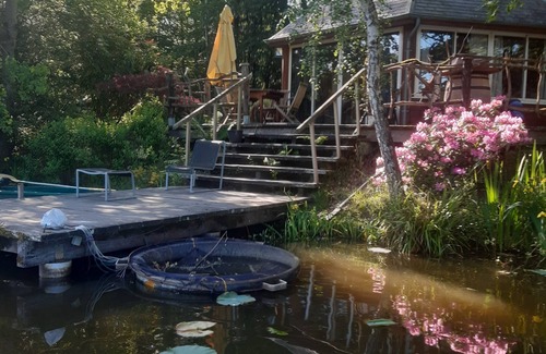 Chalet at the edge of the pond; splendid view on lake. Large terrace equipped parasol table and barbecue possibility on terrace.