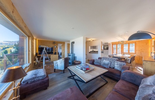Ski-in/out chalet - Luxury - 12 People - 5 Bedrooms - 4 Bathrooms - Jacuzzi - Breath taking viewsTop Floor: Bedroom 1:King size double bed en-suite bathroom with shower and bathBedroom 2:King size double bed en-suite bathroom with showerMiddle floor:Fully equipped kitchen with microwave, Nespresso machine, filter coffee, toaster, dishwasher, cheese fondue set and raclette party set.Open plan lounge and dining area with wood burning fireplace, TV room, Bluetooth sound system and toilet. Comfortable sofa bed with computer and desk, flat screen TV with Apple TV/DVD, doors opening out onto the balcony overlooking the valley.Ground floor: Bedroom 3:Double or twin bedroomBedroom 4: Bunk beds, 2X 80X190cmShared bathroom for bedroom 3&4Bedroom 5:Double or twin bedroom with en-suite bathroomSkiroom Laundry room with washing machine and dryerOutdoor jacuzzi with amazing view, garden furniture and charcoal grill. The chalet has been renovated in 2017 and 2018. The chalet has 2 parking spaces at the chalet and 2 additional places 300m from the chalet. It is not allowed to park along the road.Equipment:Induction hob, dishwasher, Nespresso coffee maker, toaster, kettle, oven, raclette and fondue set.DVD player, wifi. Hair dryers.Good to know:Included in the price for the number of people indicated at the time of booking:- beds made on arrival- towels- final cleaningOptional:- Baby pack at 25 CHF/stay (this includes a cot with mattress, a fitted sheet, a towel and a high chair)- 35 CHF for sheets and towels per additional personIn winter, access often requires chains or a 4 * 4 vehicle.Wood for the fireplace and charcoal for the grill is to be provided by the tenant.We would like to inform you that bachelor/bachelorette parties or other noisy parties are not allowed at the chalet. The neighboring chalets are occupied all year round, so it is imperative to respect the calm after 10 p.m. and not to use the jacuzzi after that time.We thank you in advance for respecting this.