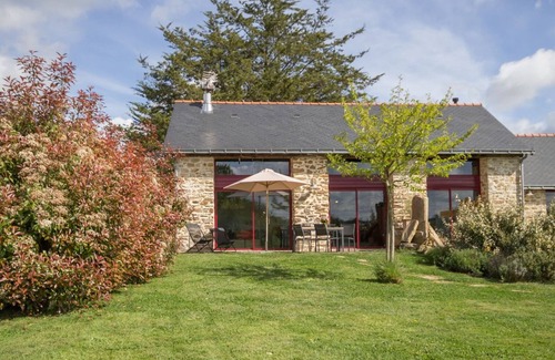 South of the town of Nort-sur-Erdre, 20 km from Nantes and 200 m from the Nantes-Brest Canal, this former 19th-century barn, facing south, has been renovated into two adjoining gîtes (sleeps 14). It features a private terrace and a large, unfenced shared outdoor area of 3,500 m² with a portico.