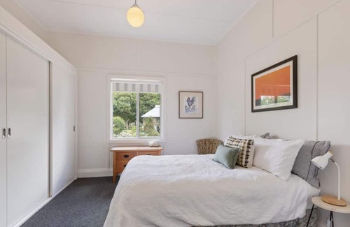 Charming, spacious farmhouse on a 150-acre sheep farm just 25 minutes out of Bega! You'll have a lovely view of the mountains, fresh eggs every morning and a clear view of our sheep from the house. The main bedrooms are decorated for your utmost comfort of an evening, two bedrooms are fitted with queen beds, and the third bedroom contains 2 plush single beds. (one of which opens up into a trundle). The kitchen is fitted with a convection oven and gas stovetop, Nespresso coffee machine, Smeg kettle, toaster and milk frother. A beautiful study where you could do some quiet reading or get some work done, and a comfy living room with a gorgeous indoor fireplace to heat the house in the winter and air conditioning for the summer months. You'll be just a 30-minute drive from Bermagui Beach, 30 minutes from the retro country town of Tilba Tilba, and 30 minutes from Biamanga National Park!