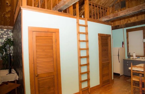 Historic schoolhouse of Brooklin converted into the perfect one bedroom getaway. Located across the street from the Brooklin Rockbound Capel with a quick 20-minute drive to Blue Hill. Acadia National Park, Bar Harbor or Bangor are all with in an hour away. The original post and beam construction, with a sleeping loft, give the interior a rustic vibe offset by the playful color palette and butterfly wallpaper make it more botanical and lighthearted.