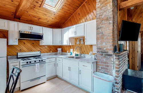 This single-level cottage is part of the Sebago Lake Lodge and Cottages, a property with 700 feet of lake frontage, swimming and docking areas, canoes to take out on the water, a fitness room, and picnic areas. As for this particular lakefront cottage, you'll enter by way of a screened front porch, where you can admire the lake as sip your coffee in the mornings. The interior is both classic and comfortable, offering wood-paneled walls and ceilings, skylights that let in the sunshine, and large windows that frame the lake outside. Begin each beautiful day by taking a canoe out on Sebago Lake Basin, Jordan Bay, or Sebago Lake, returning home to prepare a homemade breakfast in the full kitchen and sit down to eat inside or out on the screened porch.