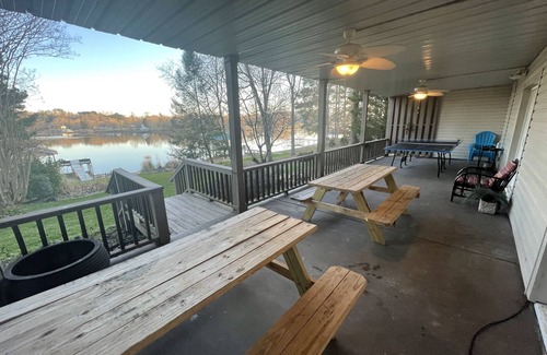 https://youtu.be/PrlCT_MNLRI … link to YouTube video…. Great views and lake front living! Two spacious decks for you to enjoy. Swimming, boating, kayaking… fire pit… foosball… 450mbps Wifi…unlimited Hot Water for large groups!