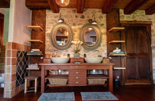 A suite composed of a charming room of yesteryear and its splendid en-suite bathroom, double basins, shower and round bathtub allowing moments of unforgettable relaxation.